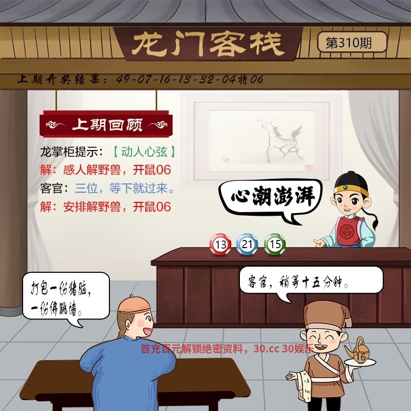 第313期掌柜:初春時節 解:味着温暖,鸟语花香 小二:客官,请稍等 解:无 客官:奶茶还有烤鱼 解:奶茶解水肖的生肖鼠、生肖猪。烤鱼解火肖的生肖蛇、生肖马 推荐九肖:羊牛鼠狗龙蛇虎猴马 推荐六肖:羊牛鼠狗龙蛇 |
