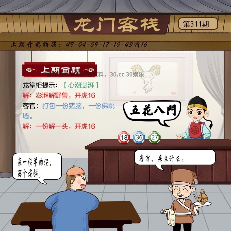 第312期掌柜:激昂慷慨 解:意思是形容情绪激动,精神振奋,充满正气 小二:客官,好的 解:无 客官:来份双人火锅 解:双人火锅解双数的生肖虎、鼠、狗、猴、马、龙 推荐九肖:牛虎鼠蛇狗兔龙马猪 |